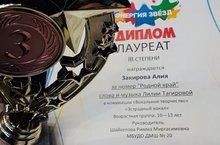 Поздравляем Победителя Международного многожанрового конкурса "Энергия Звезд" - Закирову Алию - Лауреат III степени - учащаяся ДМШ 20, воспитанница Творческой Мастреской Риммы Шайхеловой