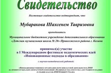 Мубаракова Ш.Т. - принимала участие в I Международном фестивале педагогических идей "Инновационные подходы в образовании" с научно-методической работой: " Инновационные решения в организации форм внеклассной деятельности в ДМШ на примере музыкально-литературной композиции "Волшебная сила искусства" для учащихся младших и средних классов ДМШ Концерт-Сказка. Царева Е.Ю. - с научно-методической работой "Мазурка в опере М.И.Глинки "Иван Сусанин"