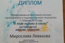 Поздравляем Левакову Мирославу, преп. Айнатуллов И.И. со званием Дипломанта Международного фестиваля-конкурса музыкального творчества "В мире музыки и сказки"