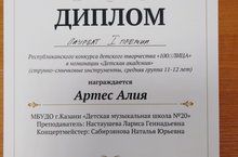 Поздравляем Артес Алию, преп. Настаушева Л.Г., конц. Сабирзянова Н.Ю. - Лауреат I степени Республиканского конкурса детского творчества "100/Лица" в номинации "Детская академия"