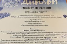 Диплом Лауреата III степени - Камашева Рената в номинации "Духовые инструменты", рук. Чернова Т.Ю., конц. Хлёсткина С.М.; Диплом Лауреата I степени - Томашевская Дарья, рук. Айнатуллова Л.И., конц. Абдуллина А.Н.; Чукавина Елена - Лауреат III степени, рук. Гарипов Р.Н., конц. Зарипова С.Н.
