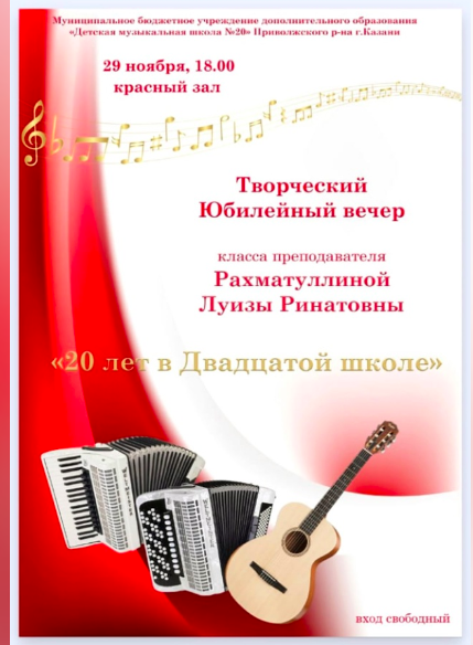 29 ноября состоялся Творческий Юбилейный Вечер "20 лет в двадцатой школе" преподавателя Рахматуллиной Луизы Ринатовны, которая преподает в ДМШ №20 с 2004 года, воспитала плеяду талантливых учеников, многие из которых выбрали своей дорогой и профессией искусство игры на любимом музыкальном инструменте. Преданного преподавателя отличает высокий профессионализм, неиссякаемое трудолюбие, усердие, творческий, индивидуальный подход к преподаванию и высокие результаты! В августе 2024 года Луиза Ринатовна награждена Почетной грамотой Министерства Образования и науки Республики Татарстан!