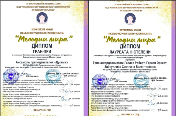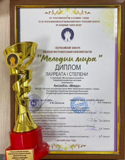 Начало декабря 2024 года ознаменовалось победой ансамбля «Млада» Детской музыкальной школы N20 Приволжского района г. Казани во Всероссийском конкурсе вокально-инструментального исполнительства «Дөнья көйләре»! Ура!
