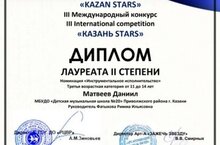 Поздравляем с успехом в III Международном конкурсе "Казань Stars" - учащегося Матвеева Даниила, класс преподавателя Риммы Ильясовны Фатыховой!