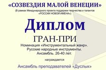 Гран-При II Международного конкурса-фестиваля детского, юношеского и взрослого творчества "Созвездия Малой Венеции" (в рамках Международного проекта поддержки творчества и талантов "РОССИИ НОВОЙ ИМЕНА") удостоен Ансамбль преподавателей ДМШ №20 "Дуслык"!