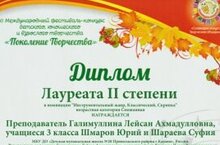 Поздравляем с победой в 21 Международном фестивале-конкурсе детского, юношеского и взрослого творчества "Поколение Творчества" Шмарова Юрия и Шараеву Суфию - Диплом Лауреата 2 степени в номинации "Инструментальный жанр, Классический, Скрипка", преподаватель Галимуллина Лейсан Ахмадулловна.