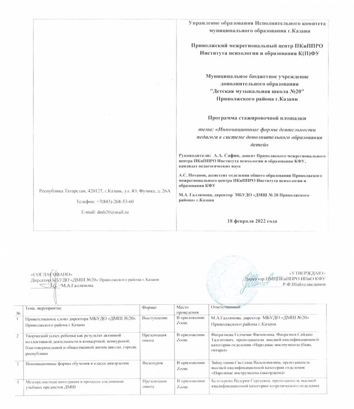- Стажировочная площадка на тему «Инновационные формы деятельности педагога в системе дополнительного образования детей», Приволжский межрегиональный центр ПКиППРО Института психологии и образования К(П)ФУ, ДМШ №20, 18.02.2022 - Программа