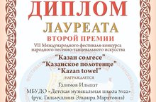 Мы поздравляем с выскими результатами Галимова Ильшата, класс преподавателя Гильмуллиной Эльвиры Маратовны. На VII Международном фестивале-конкурсе народного песенно-танцевального искусства «Казанское полотенце» он был награжден Дипломом Лауреата II премии.
