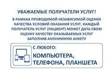 В РАМКАХ ПРОВОДИМОЙ НЕЗАВИСИМОЙ ОЦЕНКИ КАЧЕСТВА УСЛОВИЙ ОКАЗАНИЯ УСЛУГ, КАЖДЫЙ ПОЛУЧАТЕЛЬ УСЛУГ (ПАЦИЕНТ) МОЖЕТ ДАТЬ СВОЮ ОЦЕНКУ КАЧЕСТВУ ОКАЗЫВАЕМЫХ УСЛУГ
