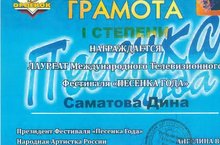 Поздравляем нашу ученицу Саматову Дину и ее преподавателя по вокалу Матвееву Майю Георгиевну с первым местом на международном телевизионном фестивале "Песенка года"!