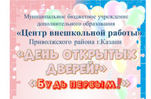 "Центр внешкольной работы" Приволжского района приглашает 3 сентября 2021 года в 17:30 на День открытых дверей "Будь первым!" по адресу: ул.Камая, 13