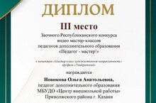 Подведены итоги заочного Республиканского конкурса видео мастер-классов педагогов дополнительного образования «Педагог-мастер!». Поздравляем педагога художественно-эстетического отдела Новикову Ольгу Анатольевну принявшую участие в номинации «Мастер-класс художественной направленности», профиль «Театральный». Педагог награжден дипломом III место.