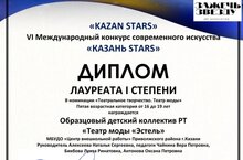 Образцовый детский коллектив Республики Татарстан — Театр моды «Эстель», стал лауреатом первой степени Международного конкурса современного искусства «Казань STARS» в номинации «Театральное творчество. Театр моды». Это замечательное достижение подчеркивает высокий уровень мастерства юных участников коллектива и мастерство педагогов, вкладывающих душу в свою работу. Желаем всему коллективу дальнейших успехов!