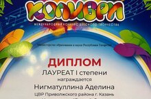 Юная воспитанница Элеоноры Ринатовны Калашниковой, Нигматуллина Аделина, стала призером на Международном конкурсе детского творчества «Колибри». Сердечно поздравляем и желаем новых побед!