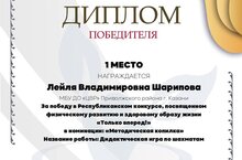 Подведены итоги Республиканского конкурса, посвященного физическому развитию и здоровому образу жизни «Только вперед!». Педагог дополнительного образования Шарипова Лейля Владимировна приняла участие и награждена дипломом - I место, в номинации «Методическая копилка» - дидактическая игра по шахматам. Поздравляем! Желаем вдохновения, дальнейших творческих успехов и побед!