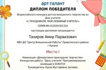 Подведены итоги Всероссийского конкурса детско – юношеского творчества в котором принимали участие обучающиеся из объединения «Занимательная информатика» (руководитель Заляева Луиза Мустафовна). Ребята программировали праздничные музыкальные анимированные открытки в SCRATCH "День учителя". В конкурсе принимали участие 22 обучающихся второго и третьего годов обучения. Из них призовые места получили 11 человек, остальные стали лауреатами Всероссийского конкурса.