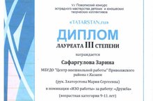 Воспитанница студии Жар-птица - Сафаргулова Зарина стала лауреатом III степени за рисунок "Дружба" в XV Поволжском конкурсе эстрадного мастерства детских и юношеских творческих коллективов "TATARSTAN.ru".