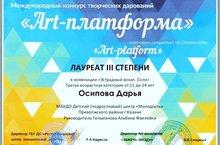 В международном конкурсе "Арт-платформа" Осипова Дарья (педагог дополнительного образования Гильманова А.Ф.) стала Лауреатом III степени. Поздравляем! Желаем в дальнейшем творческих успехов!