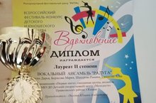 Во всероссийском конкурсе детского и юношеского творчества "Вдохновение" вокальный ансамбль "Радуга" (объединение "Эстрадный вокал", педагог дополнительного образования Овсепян Ю.А.) в номинации "Первые шаги", возрастная категория - смешанная группа, ансамбль стал Лауреатом II степени. Поздравляем!