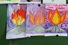 Учащиеся объединения "Акварель" (педагог Чуракова Д.А.) нарисовали рисунки к празднику 9 мая - портрет Победы, цветы, Вечный огонь, салют над Москвой и Казанью.