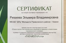 Педагог дополнительного образования Детского (подросткогого) центра "Молодость" Ризаева Эльмира Владимировна приняла участие в мастер-классе по теме: "Режиссерско-постановочное решение и приемы в подготовке танцевального номера" в рамках X открытого Поволжского конкурса эстрадного мастерства детских и юношеских творческих коллективов "TATARSTAN.ru".