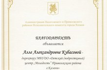 Администрация Вахитовского и Приволжского районов Исполнительного комитета города Казани объявила благодарность Алле Александровне Кубасовой - директору МБУДО "Детский (подростковый) центр "Молодость" Приволжского района г.Казани за благородный труд, педагогическое мастерство, значительный вклад в развитие эстетического образования и в связи с 25-летием со дня основания центра. Поздравляем!