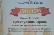 На прошедшем вчера Открытом региональном конкурсе детского творчества приняла участие воспитанница ДПЦ "Молодость" - Губайдуллина Зарина (педагог - Селиваноских А.Ю.). Зарина получила диплом лауреата 1 степени в номинации "Художествнное слово".