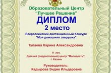 Воспитанница объединения "Город мастеров" Тупаева Карина (педагог Кадырова Э.И.) заняла 2 место во Всероссийском дистанционном конкурсе "Моя домашняя зверушка". Поздравляем!