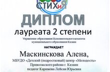 Поздравляем победителя 7 Городского конкурса театрального искусства среди обучающихся общеобразовательных учреждений и учреждений дополнительного образования "СТИХиЯ" Маскинскова Алена (педагог Каримова Л.Ю.). Он стал лауреатом 2 степени! Желаем дальнейших творческих успехов!
