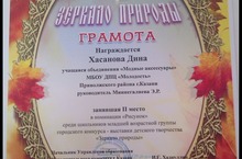 Воспитанница объединения «Модные аксессуары» Хасанова Дина заняла 2 место в номинации «Рисунок» среди школьников младшей возрастной группы «Городского конкурса-выставки детского творчества «Зеркало природы»,которая состоялась 15-25 октября 2013 года. Руководитель: Миннегалиева Э.Р.