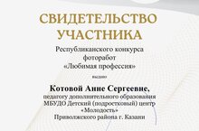 Педагог дополнительного образования Котова А. С. приняла участие в республиканском конкурсе фоторабот "Любимая профессия", который организовал ГБУ ДО "Республиканский центр внешкольной работы".