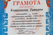 Педагог дополнительного образования Блашенкова Т. А. заняла 1 место в традиционном турнире СРОО "ФСК" по КАРАТЭ "ВАДО-КАЙ", посвящённый памяти павшим в Великой Отечественной войне "Никто не забыт, ничто не забыто" в программе "КАТА" среди женщин 18 лет.