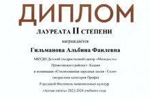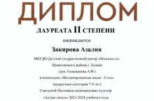 По итогам Городского Фестиваля национальных культур "Алтын сәгать" педагог дополнительного образования, руководитель объединения "Вокальный ансамбль "ДоРеMix" Гильманова Альбина Фаилевна стала Лауреатом 2 степени в номинации "Стилизованная народная песня - Соло". Поздравляем!