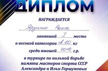 В турнире по вольной борьбе памяти мастеров спорта СССР Александра и Ильи Горшуновых учащийся объединения "Вольная борьба" (педагог - Дружков Сергей Геннадьевич) Яруллин Раиль занял 1 место в весовой категории св.60 кг, среди юношей 2012 г.р. Поздравляем! Желаем дальнейших побед!