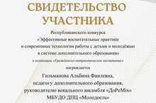 Педагог дополнительного образования Гильманова Альбина Фаилевна приняла активное участие в Республиканском конкурсе "Эффективные воспитательные практики и современные технологии работы с детьми и молодежью в системе дополнительного образования" в номинации "Гражданско-патриотическое воспитание".