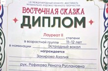 Поздравляем Лауреата 2 степени и обладателя специального приза в номинации "За яркий сценический образ" Международного конкурса "Восточная сказка" учащуюся объединения "Вокальный ансамбль До-Ре-mix" Закирову Азалию! Под руководством замечательного педагога Рафиковой Р.Р. наша очаровательная солистка покорила сердца жюри и зрителей своим ярким талантом!В рамках конкурса Азалия поучаствовала в мастер-классе по актёрскому мастерству заслуженного артиста РТ, режиссёра-сценариста, доцента кафедры театрального искусства и режиссуры Зарипова Азата Анасовича. А так же учащаяся получила грант на обучение в размере 5 000 тысяч рублей. Мы гордимся твоими успехами, Азалия! Пусть твоя музыкальная карьера продолжается яркими выступлениями и новыми достижениями!
