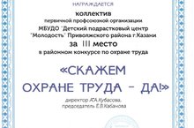 15 сентября на районном заседании председателей первичной Профсоюзной организации нашему председателю профкома Кабановой Е.В. торжественно вручили Диплом. Коллектив нашего Центра - МБУДО Детский (подростковый) центр "Молодость" Приволжского района г. Казани- занял 3 место в районном конкурсе по охране труда "Скажем охране труда-Да!" . Поздравляем и желаем дальнейших творческих успехов!