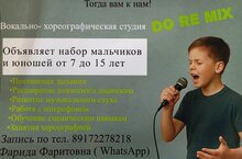 Мы набираем мальчиков и юношей от 7 до 15 лет в вокально-хореографическую студию До-Ре-mix! Ведь благодаря пению голос становится свободным и гибким, улучшается осанка, формируются сценические навыки. А танцевальные движения украсят любую песню. Приходите и вы не пожалеете!