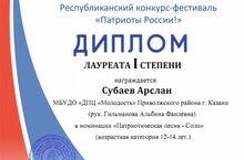 По итогам Республиканского конкурс-фестиваля "Патриоты России" в номинации "Патриотическая песня - соло" воспитанник ДПЦ "Молодость" Субаев Арслан объединения "Вокальный ансамбль "ДоРеMix" (педагог - Гильманова А.Ф.) стал Лауреатом I степени. Поздравляем и желаем дальнейших творческих успехов!