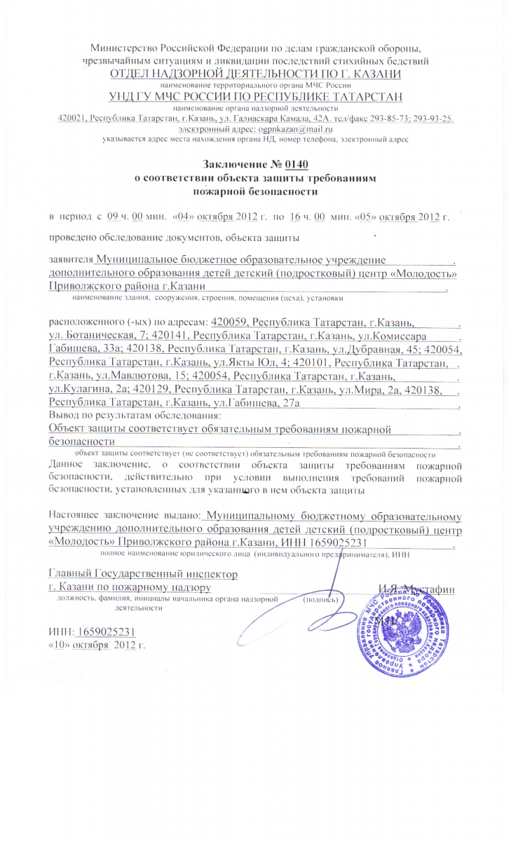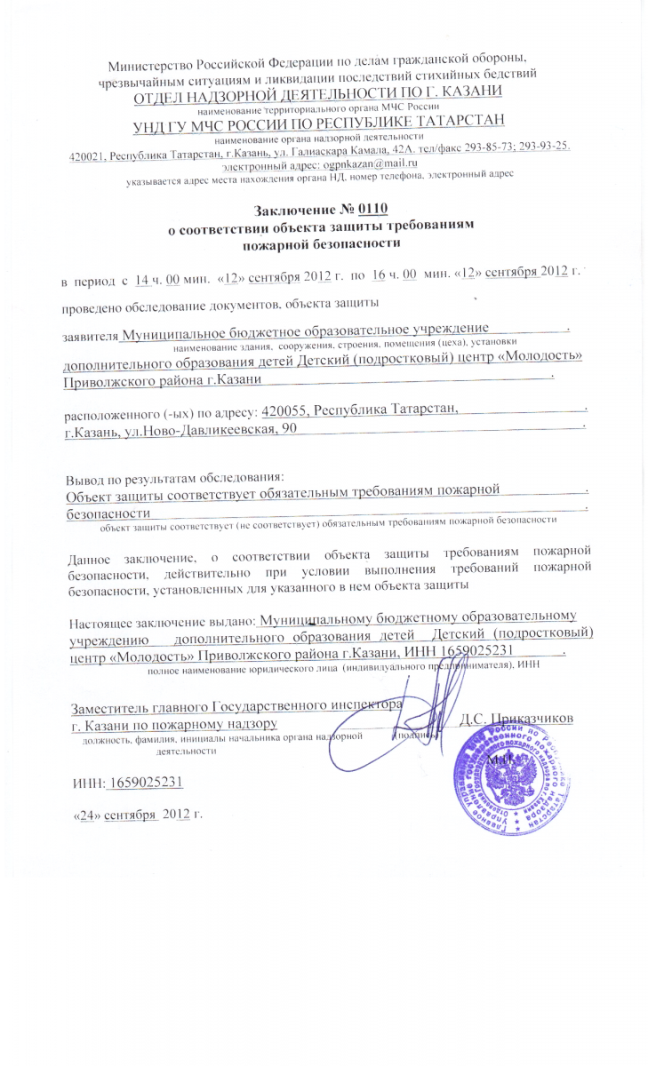 Заключение о соответсвии объекта защиты обязательным требованиям пожарной безопасности
