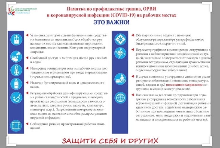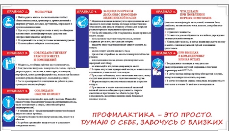 Опубликовано: 01.04.2020Памятка по профилактике гриппа, ОРВИ и коронавирусной инфекции (COVID-19) на рабочих местах