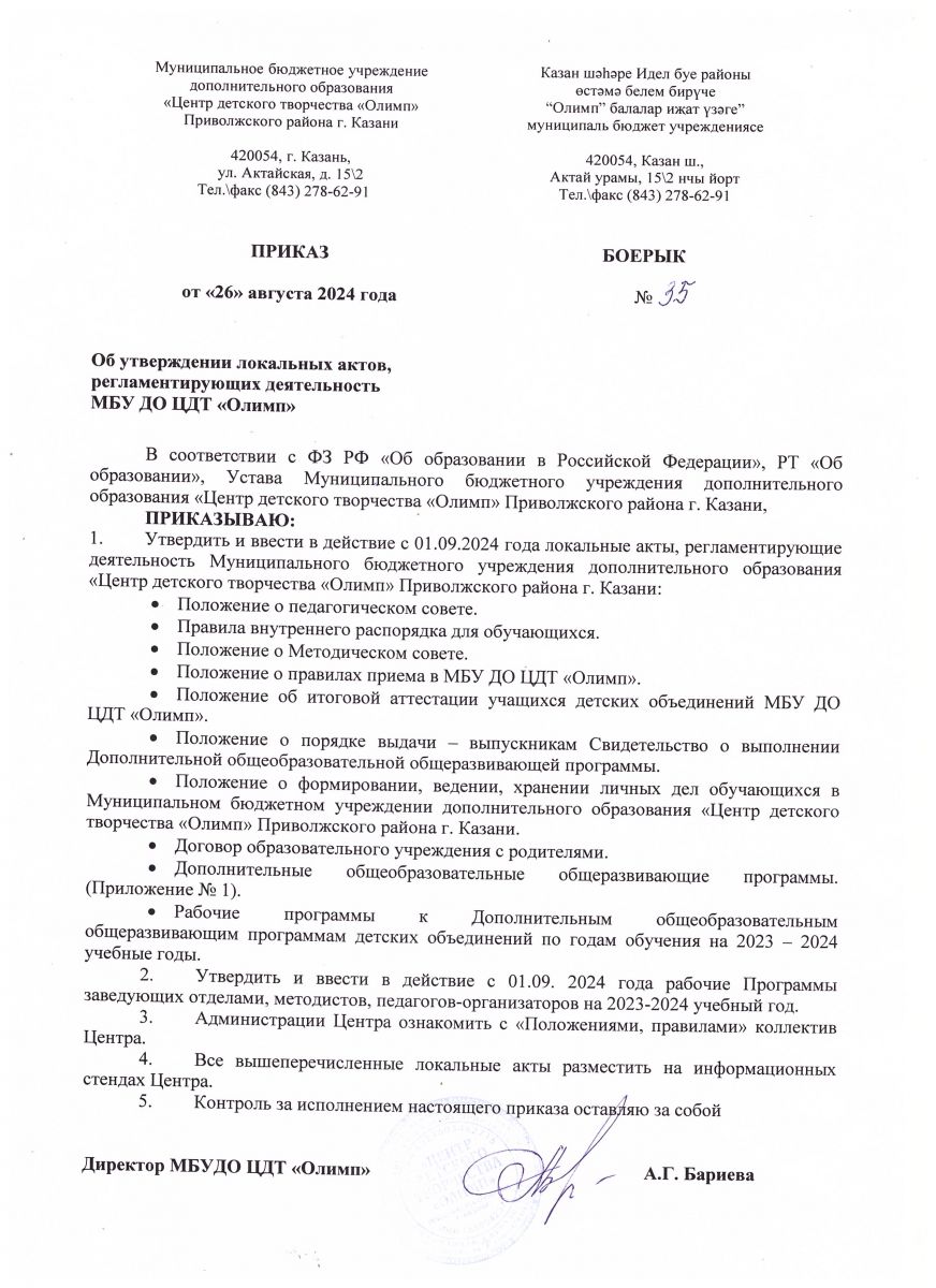 Приказ об утверждении локальных актов, регламентирующих деятельность МБУДО ЦДТ "Олимп"