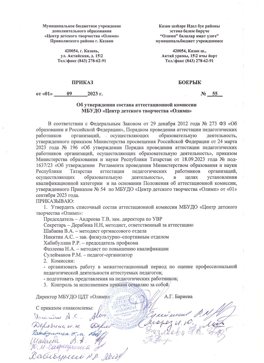 Приказ об утверждении состава аттестационной комиссии МБУДО ЦДТ "Олимп", 2023г.