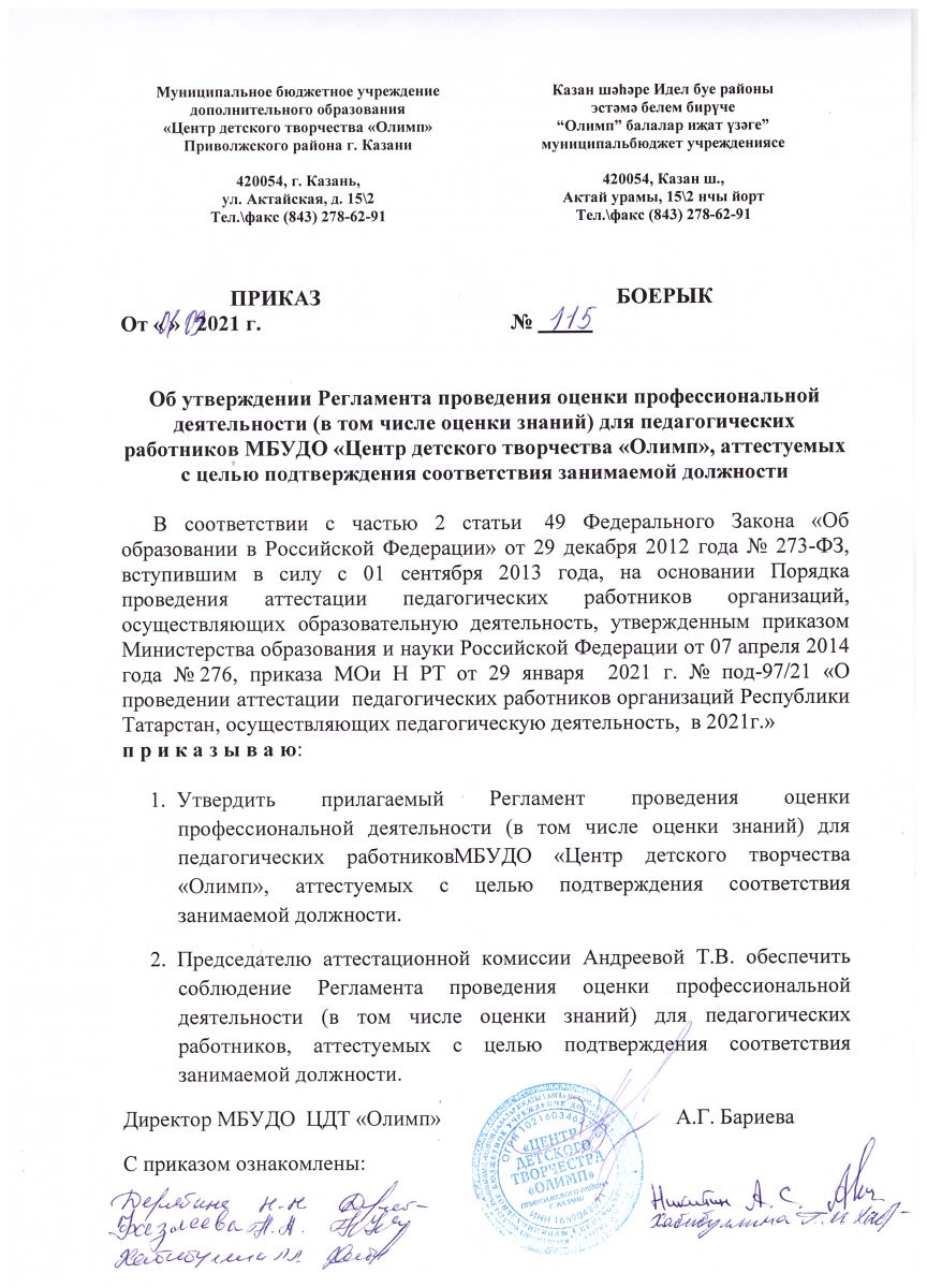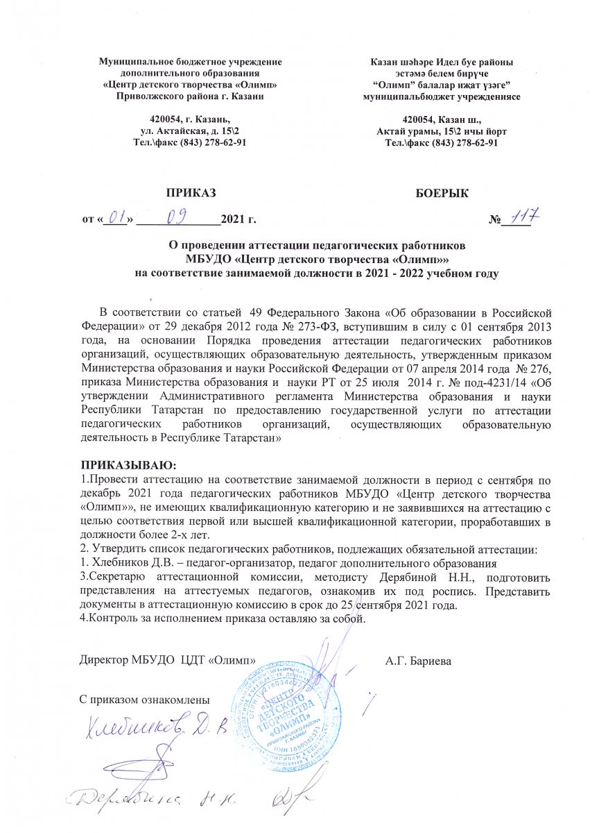 Приказ об утверждении Положения об аттестационной комиссии МБУДО ЦДТ "Олимп", 2021-2022 учебный год