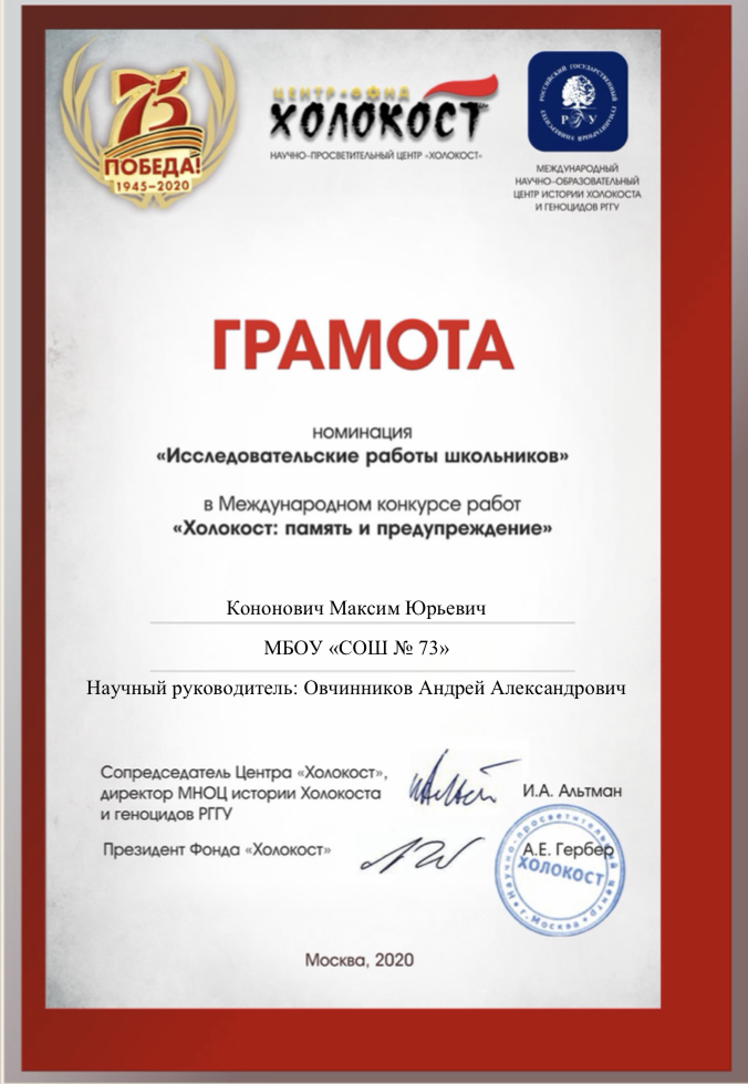 Опубликовано: 27.01.2021В этом году Максим Кононович, ученик 8 "А" класса принял участие в Международном конкурсе работ "Холокост:память и предупреждение" в номинации "Исследовательские работы школьников", научным руководителем выступил учитель истории и обществознания Андрей Александрович Овчинников.