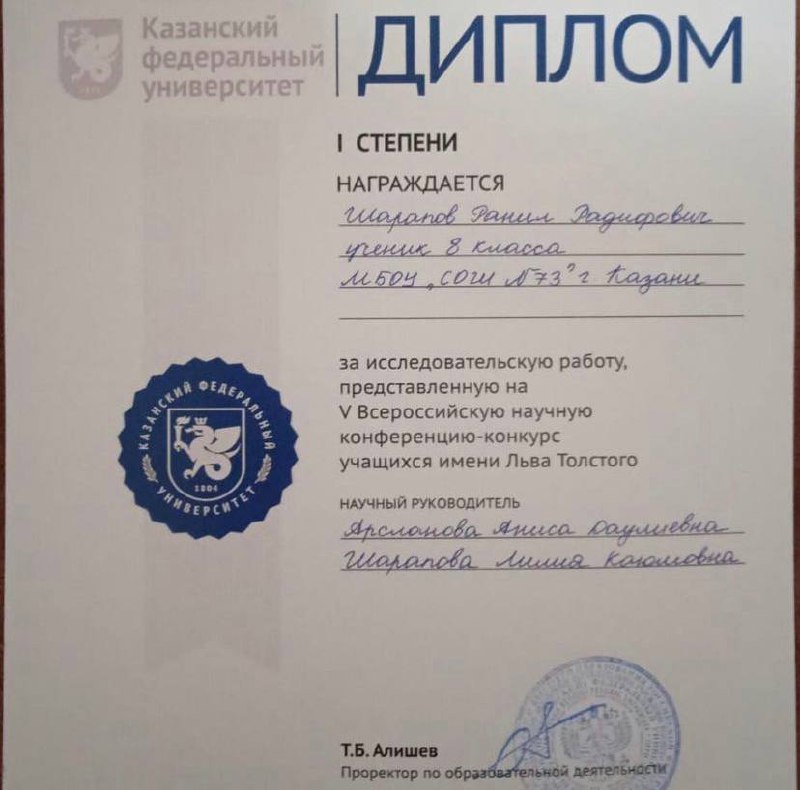 Работа, которую он выполнил под руководством учителей татарского языка и литературы Арсланова А.Д. и Шараповой Л.К., была высоко оценена жюри, ей было присуждено I место в секции.Поздравляем Ранила и желаем успехов! Гордимся высокими результатами наших учеников!