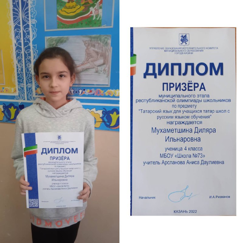 Опубликовано: 26.02.2023Призёрами муниципального этапа в республиканской олимпиады школьников по предмету: «Татарский язык для учащихся татар школ с русским языком обучения» стали наши ученицы 4 класса Мухаметшина Диляра и Губаева Асиля. Поздравляем девочек и гордимся нашими учениками.