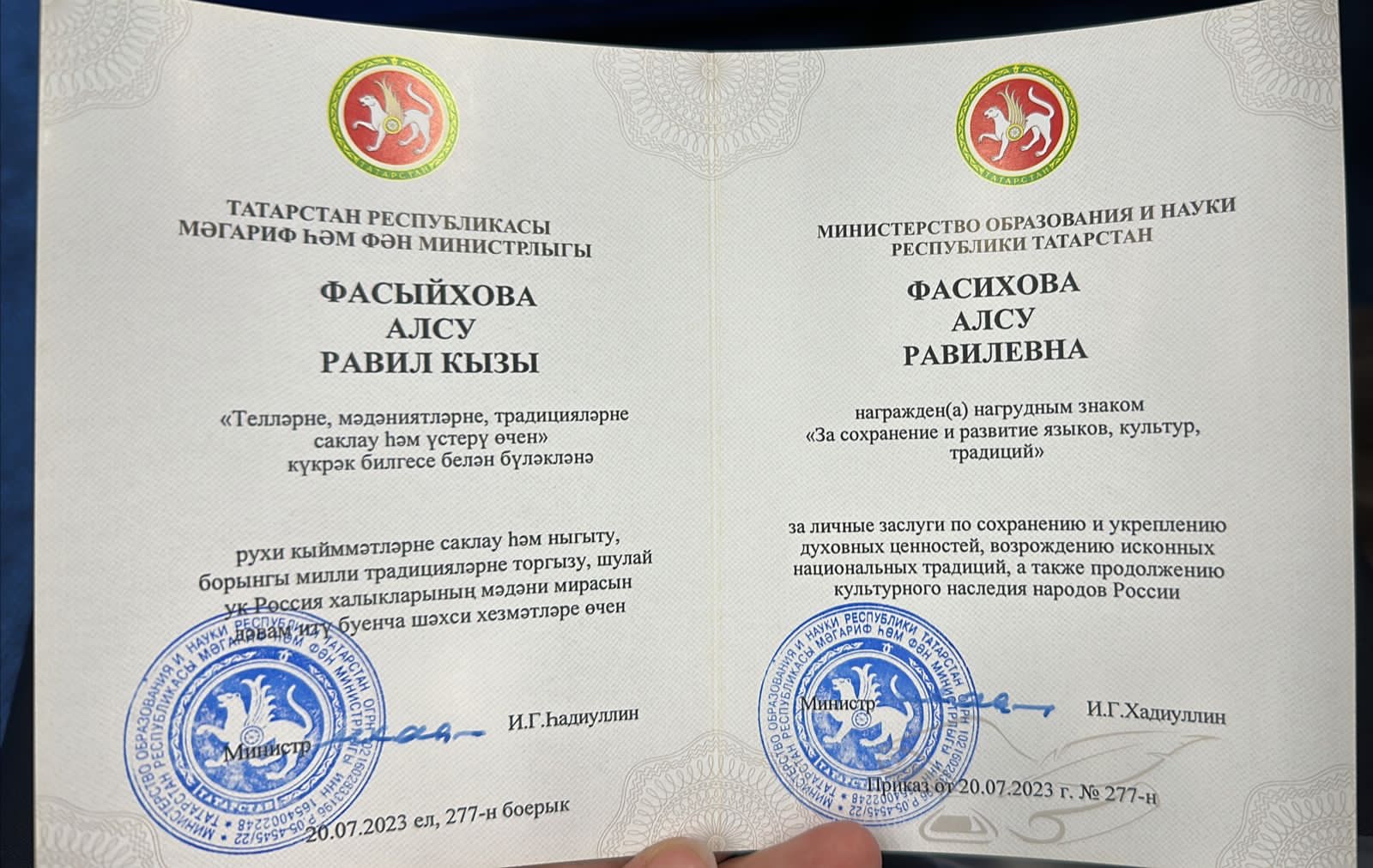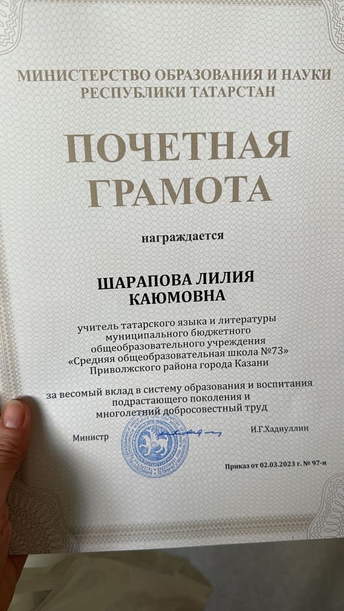Почётной грамотой Министерства образования и науки Республики Татарстан за весомый вклад в систему образования и воспитания подрастающего поколения и многолетний добросовестный труд