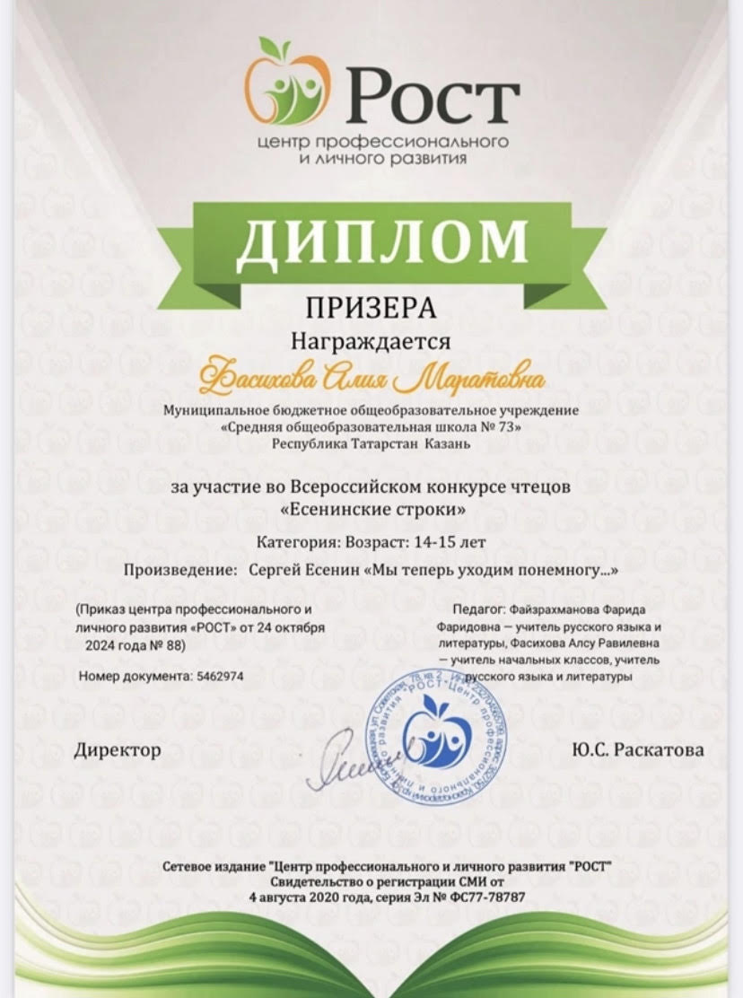 Опубликовано: 25.11.2024Поздравляем наших талантливых учеников с яркими победами на Всероссийском конкурсе чтецов «Есенинские строки»! Мы гордимся тем, что наши ребята смогли продемонстрировать свои навыки и любовь к поэзии Сергея Есенина. Их труд принес заслуженные результаты!