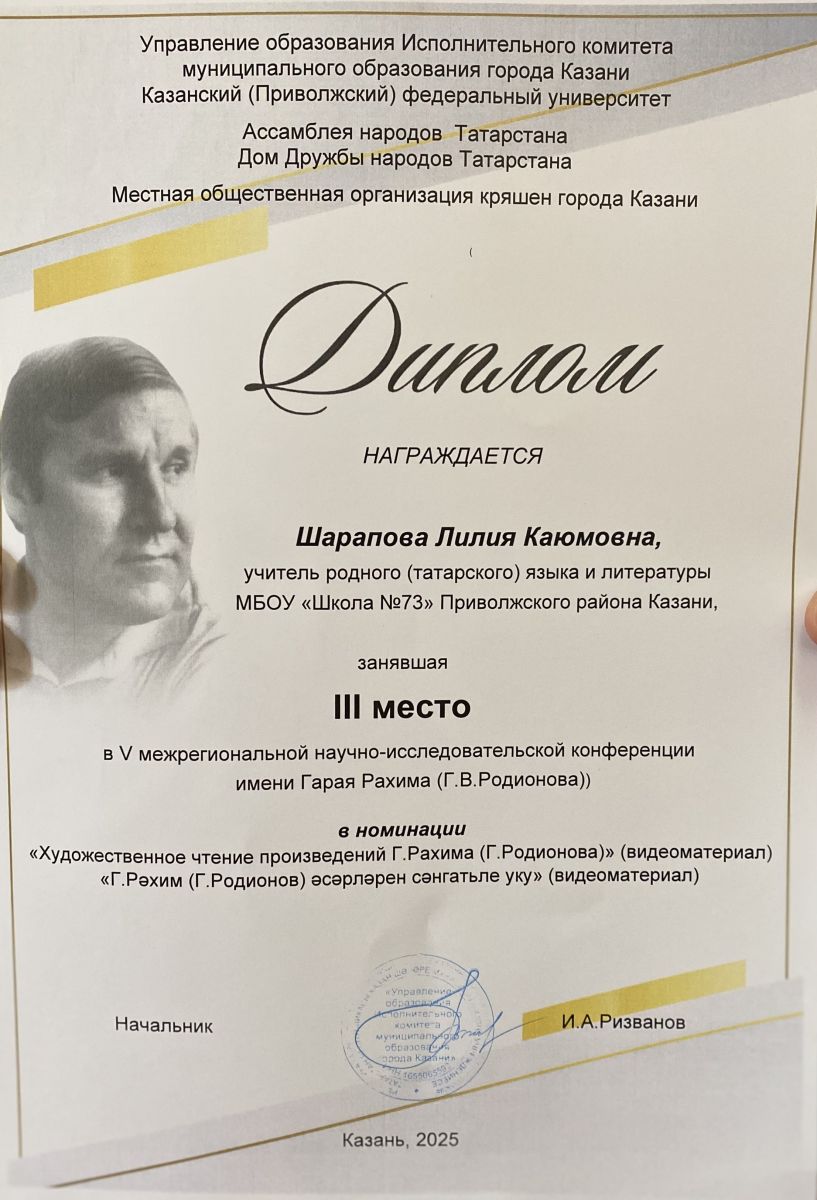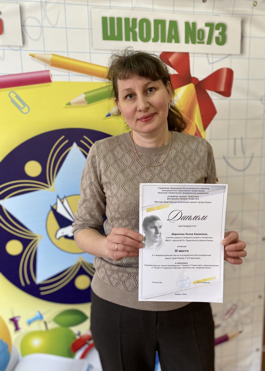 С гордостью сообщаем, что наш учитель родного языка татарского, Лилия Каюмовна Шарапова, заняла 3 место на 5 межрегиональной научно-исследовательской конференции имени Гарая Рахима!